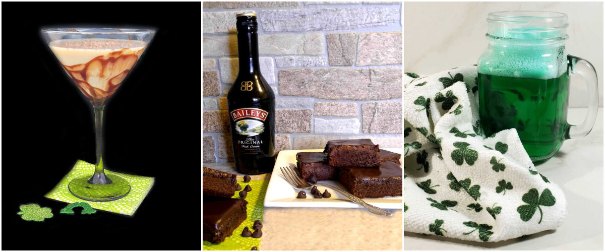A collage with images of a creamy Baileys drink, Baileys Irish cream brownies and green beer.