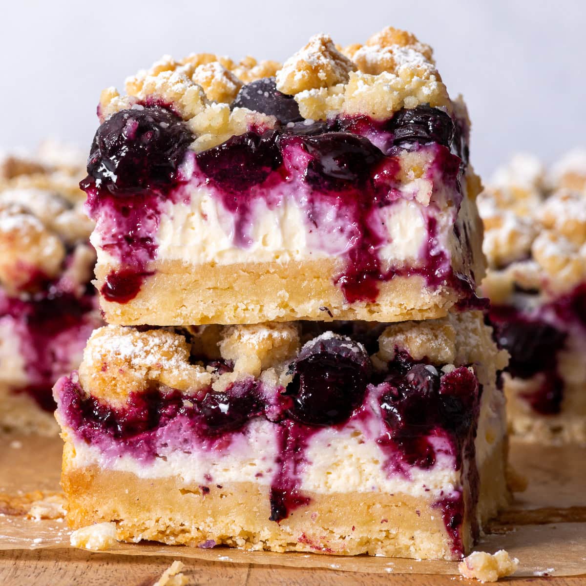 These gluten free blueberry cheesecake bars combine a buttery lemon shortbread with a creamy vanilla cheesecake layer and juicy blueberries.