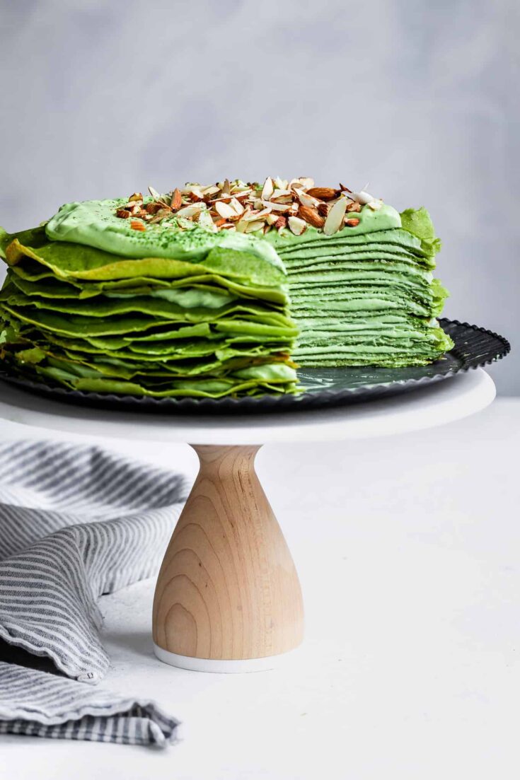 This matcha crepe cake recipe layers thin gluten-free matcha almond flour crepes with fluffy matcha whipped white chocolate ganache.