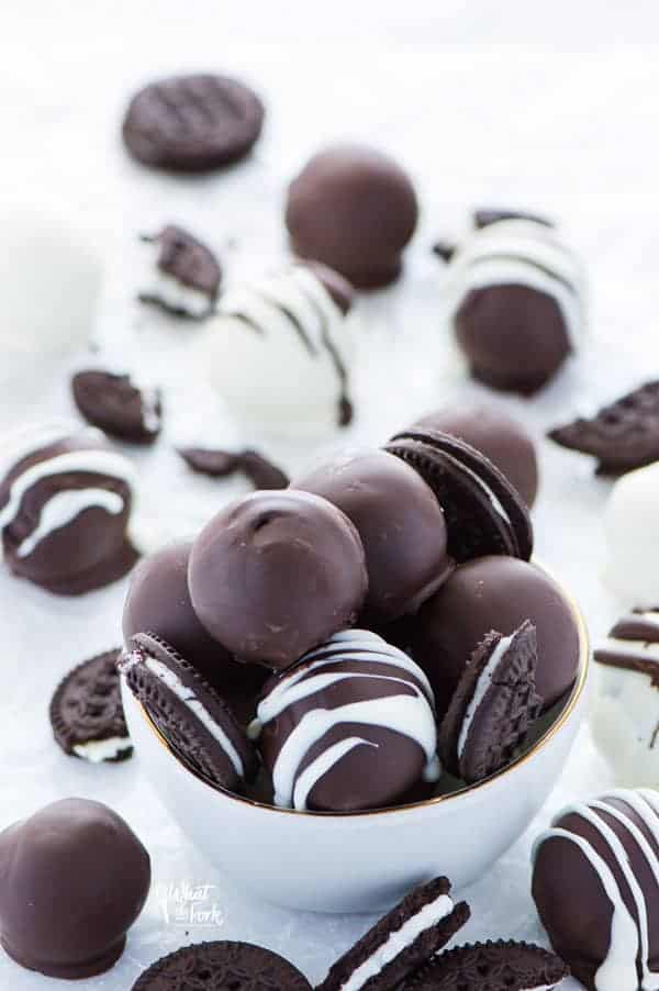 Chocolate covered gluten free Oreo truffles make an easy, no-bake dessert. These truffles have a soft creamy interior with a satisfying chocolate coating.
