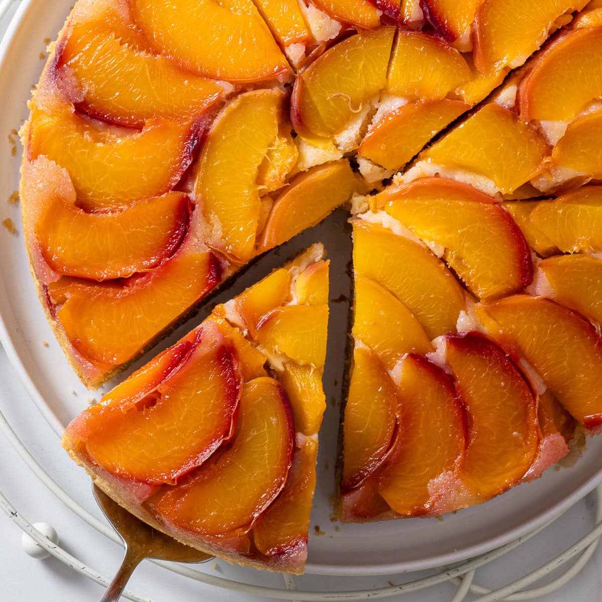 This gluten free peach upside down cake combines a soft, buttery vanilla sponge with a layer of juicy, tender peaches – and it’s really easy to make!