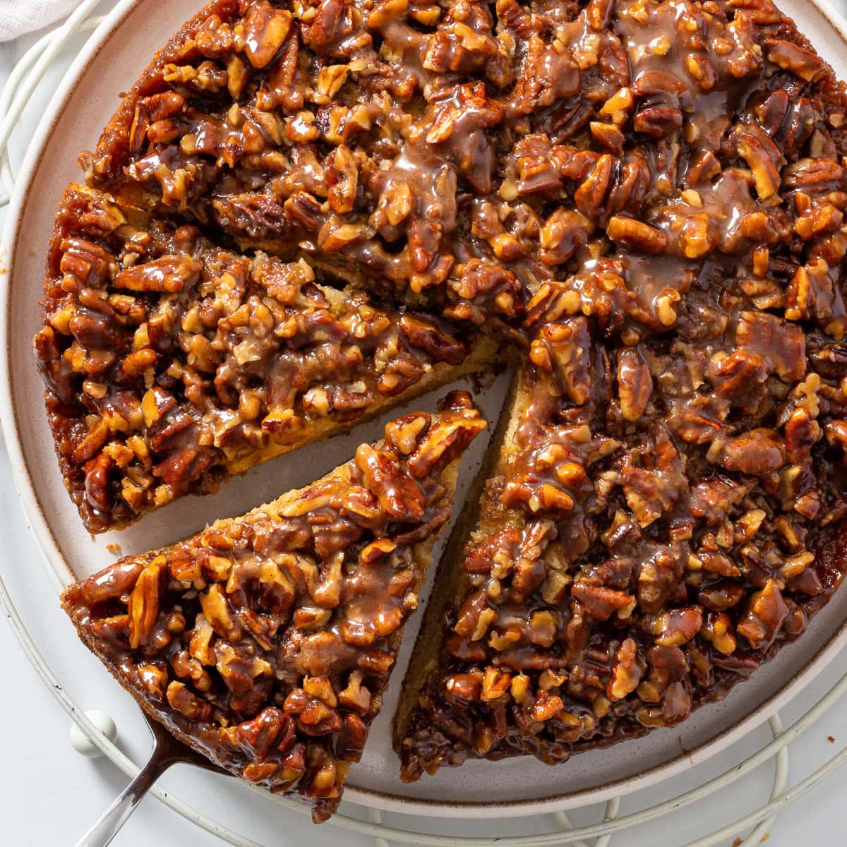 This pecan upside down cake combines a soft and tender buttermilk cake with a rich caramel pecan topping, and it's super easy to make!