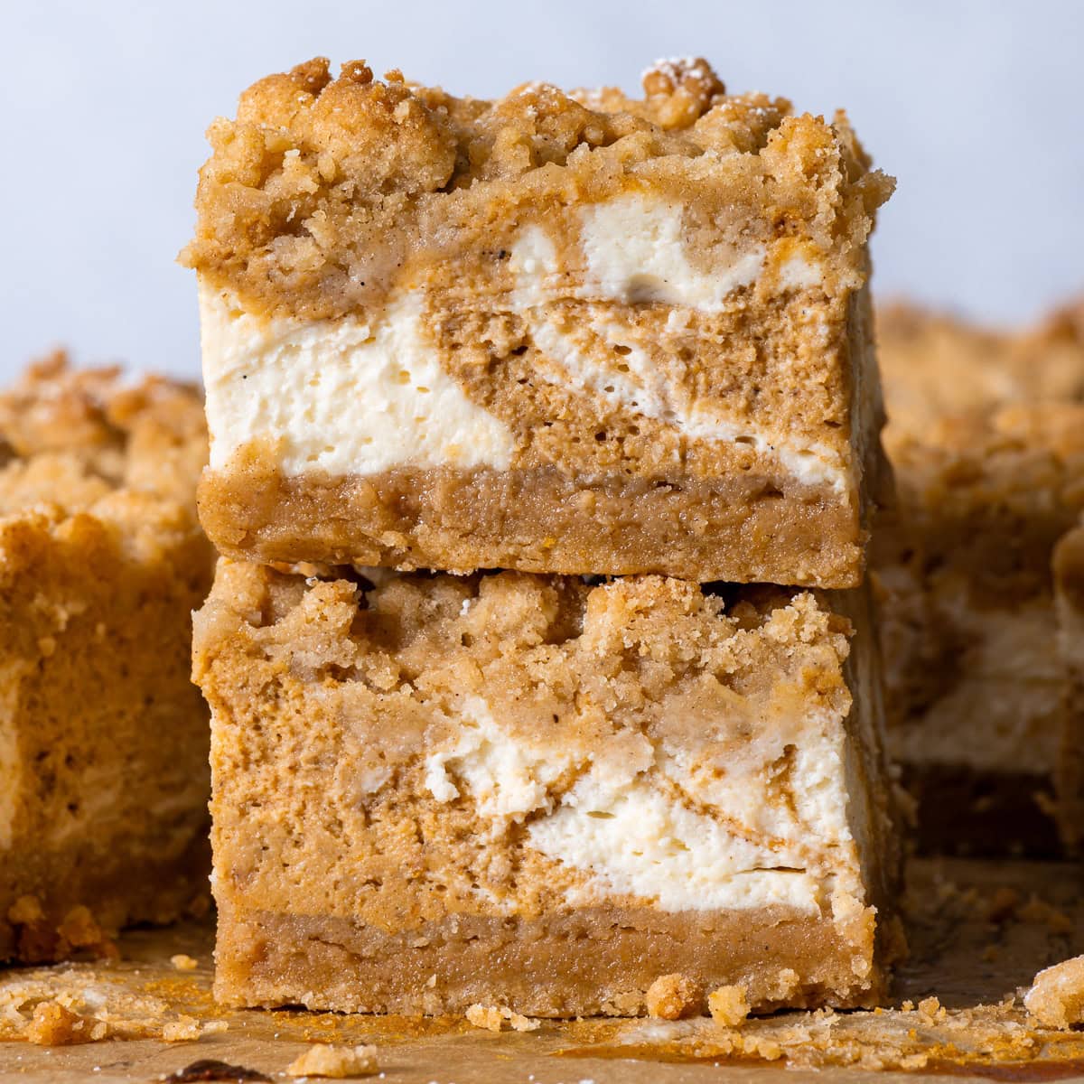 These gluten free pumpkin cheesecake bars combine a buttery cinnamon-ginger shortbread with a swirled layer of pumpkin and vanilla cheesecake filling.