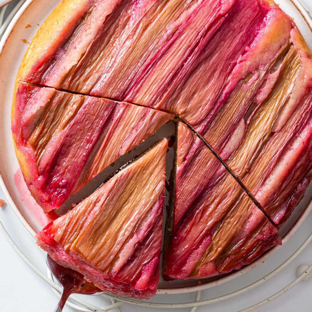 This gluten free rhubarb upside down cake combines a soft, buttery vanilla cake with a layer of juicy, sweet-tart rhubarb, and it’s super easy to make.