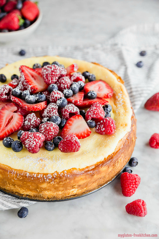 When the craving hits for a slice of cheesecake, you can make this delicious gluten-free cheesecake and top it with berries or your other favorite toppings!